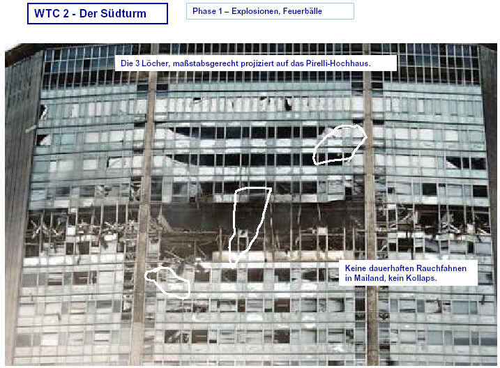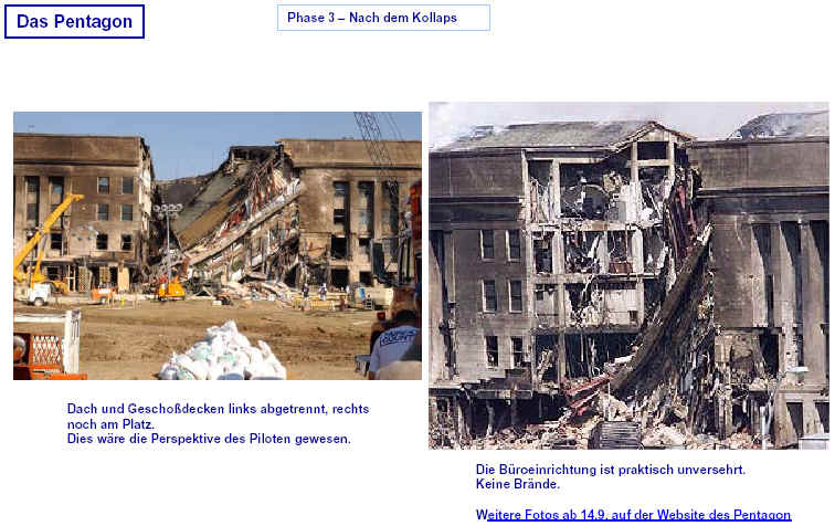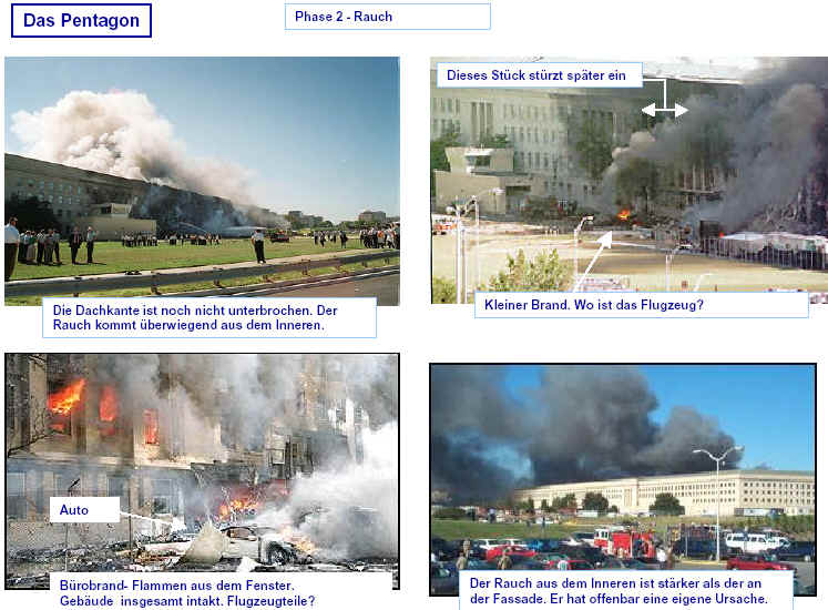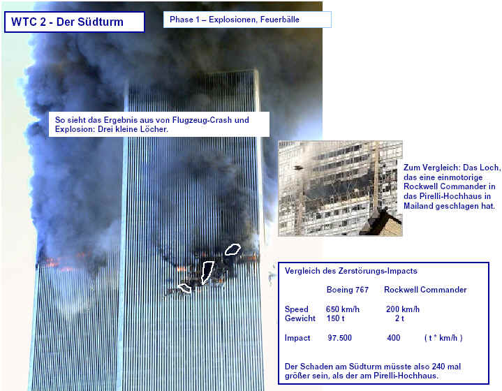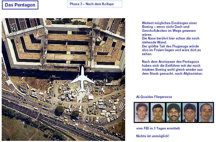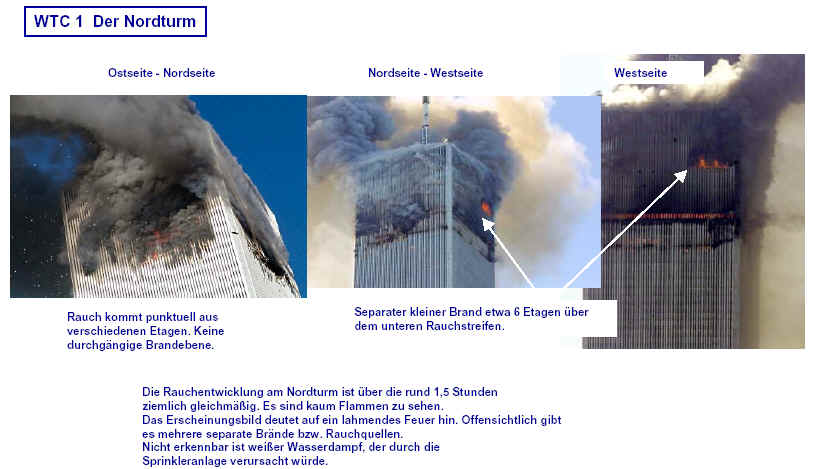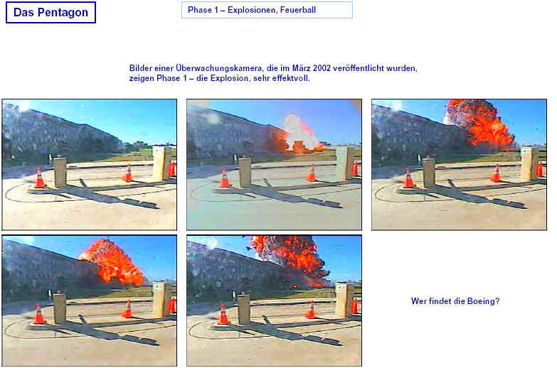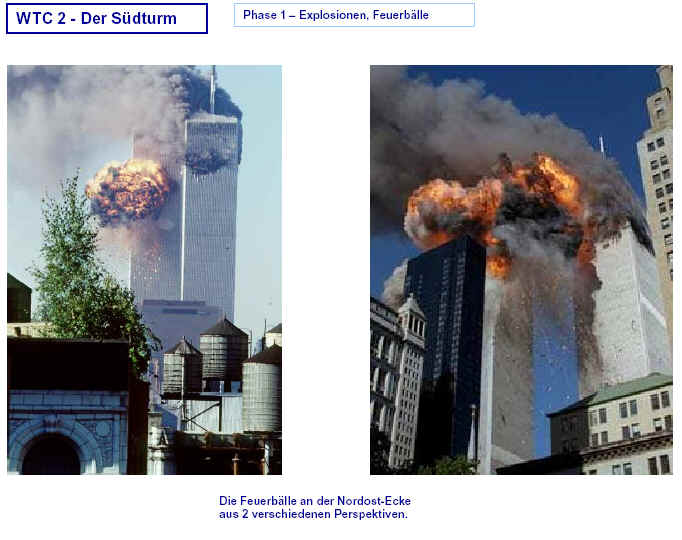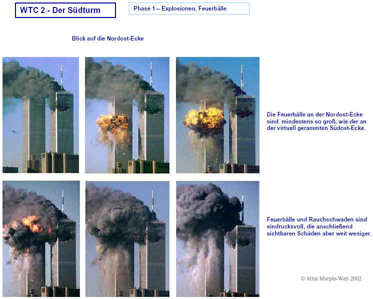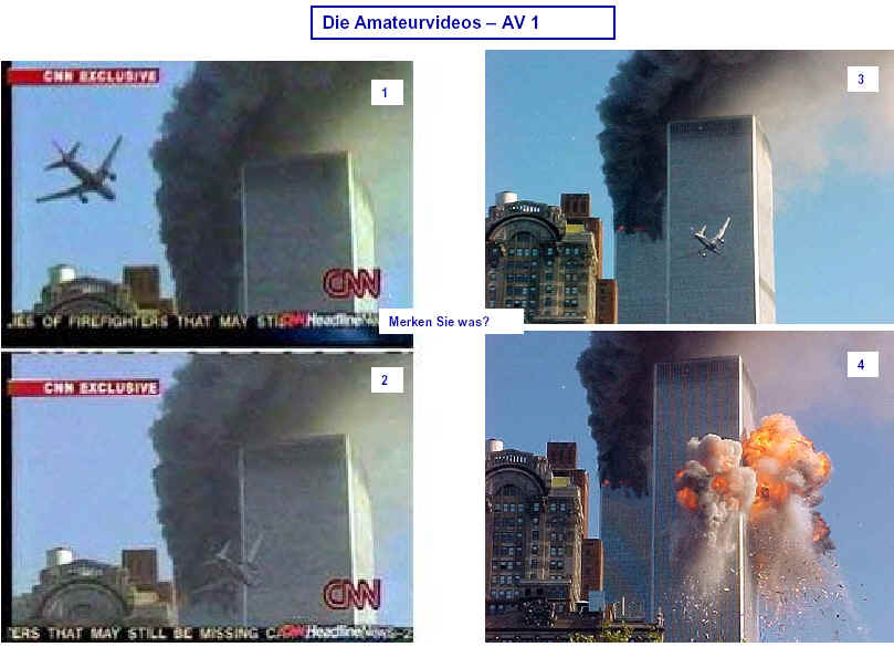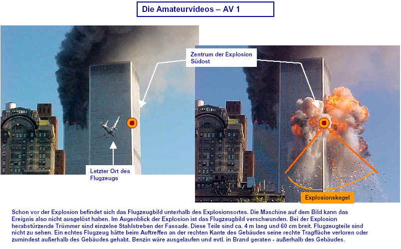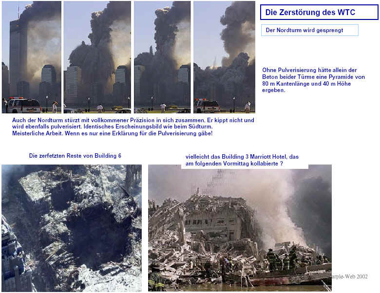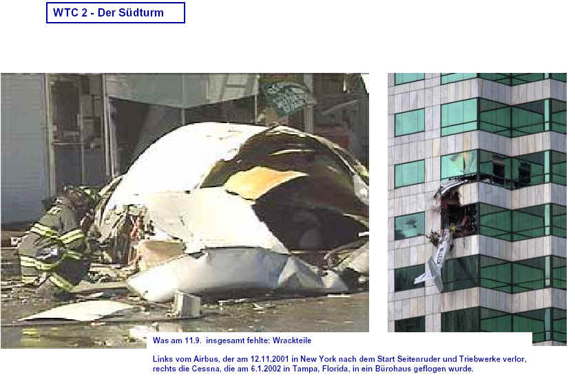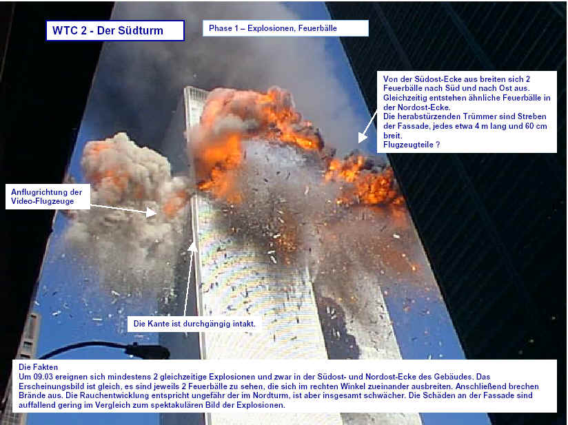 Drei Ergebnisse die zunehmend untermauert werden 1. Die sichtbaren Schäden am World-Trade-Center vor dem Kollaps sowie am Pentagon lassen sich kaum auf den Einschlag von Passagiermaschinen zurückführen. Dieser Sachverhalt wird durch das offensichtliche Fehlen von Flugzeugteilen unterstützt. Die Ereignisse an WTC 1+2 sowie dem Pentagon bestehen aus 3 Phasen: 1. Spektakuläre Explosionen bzw. Feuerbälle, danach werden Schäden an der Fassade sichtbar. 2. Rauchfahnen 3. Kollaps Details: WTC 1 der Nordturm, WTC 2 der Südturm, das Pentagon 2. Nicht nur die beiden Türme WTC 1 und WTC 2 sind plötzlich zu Staub kollabiert, sondern auch zwei andere Gebäude Stunden später. 11 weitere Gebäude sind teilweise eingestürzt oder wurden schwer beschädigt. Der obere Bereich von WTC 6 explodiert in dem Augenblick, wo der Südturm zu kollabieren beginnt. Das Ausmaß der Zerstörung und ihre zeitliche Abfolge lassen sich kaum als Kettenreaktion erklären, die durch brennendes Flugzeugbenzin ausgelöst wurde. Details. 3. Die im Fernsehen gezeigten Amateurvideos über den Anflug einer Maschine auf den Südturm zeigen Spuren von Bearbeitung. Dies ist nichts Ungewöhnliches, denn viele Video-Amateure verfügen über Software wie z.B. Videoshop, mit der man u.a. Filmsequenzen per Mausklick überlagern kann. Verständlich, dass die Sender damals in der Eile keine Echtheitsüberprüfung durchführen konnten. Beispiele. Und außerdem: die Absturzstelle in Pennsylvania und der Kurssturz der Aktien von (Rück)versicherungskonzernen und Fluggesellschaften vor dem 11.9.