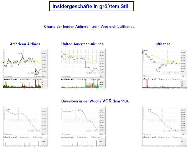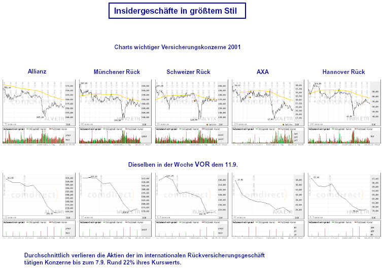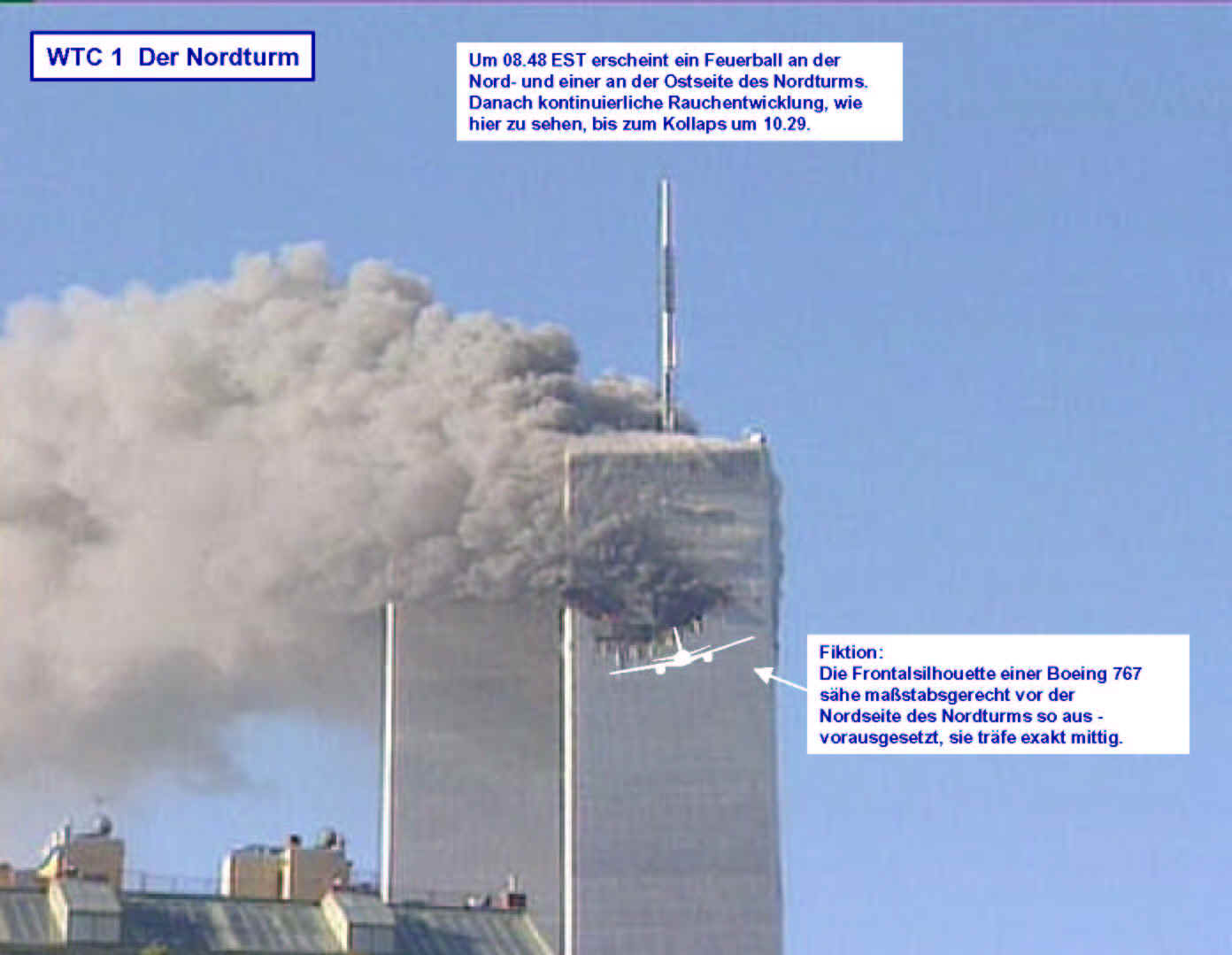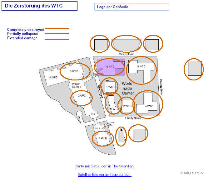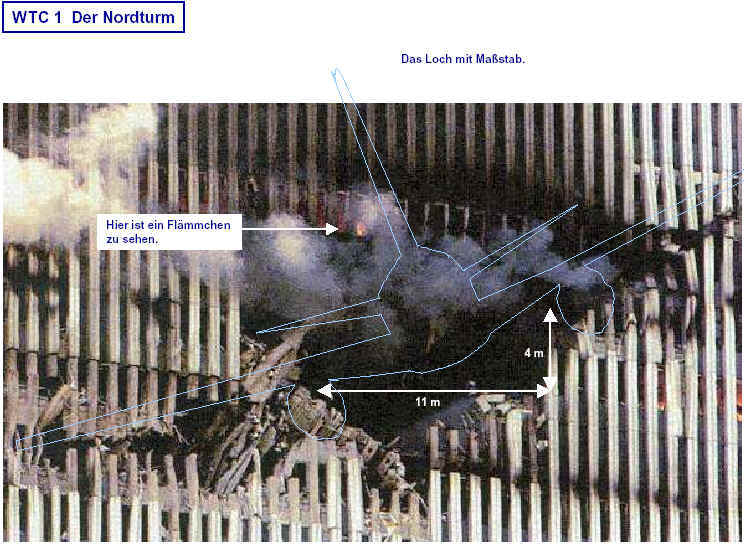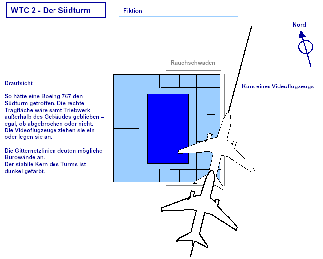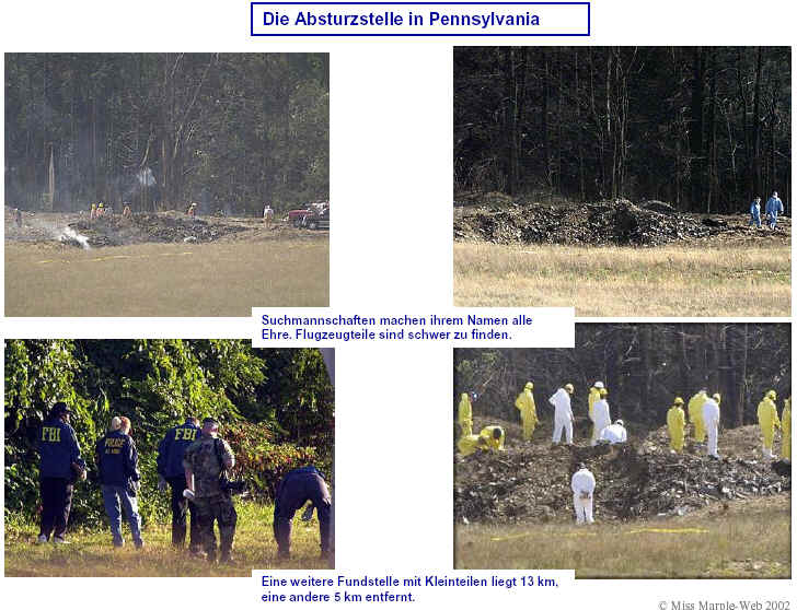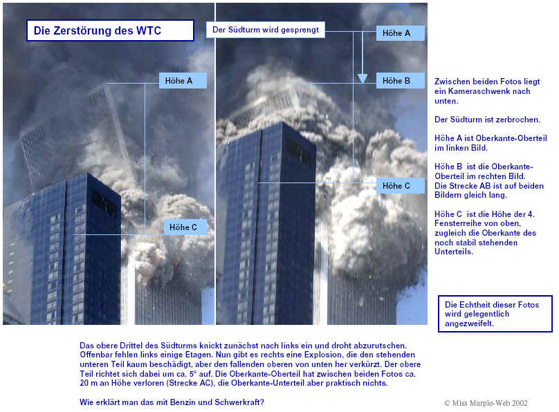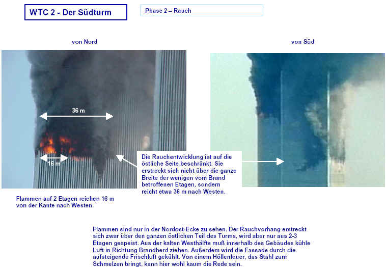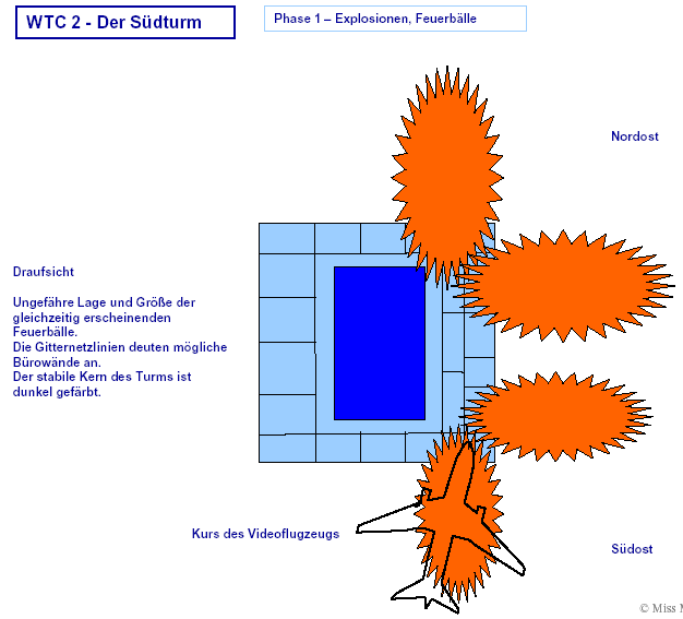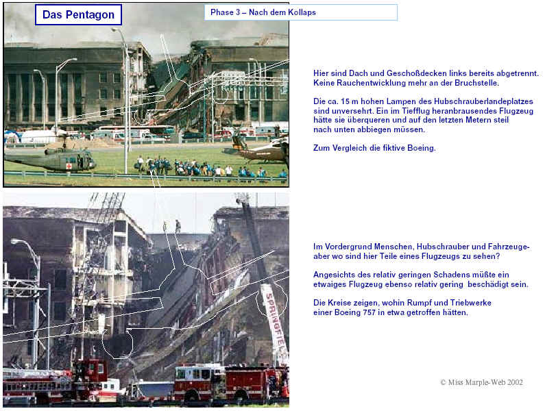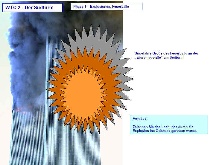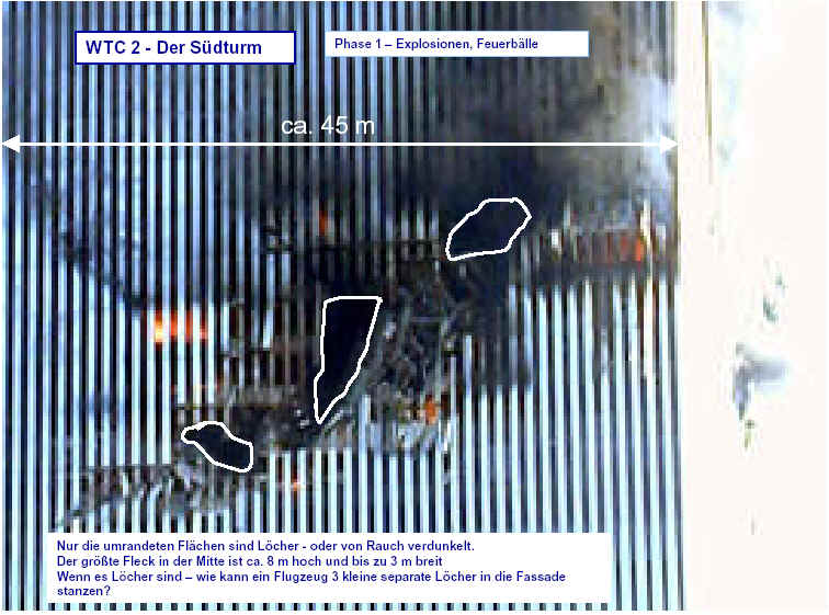 Drei Ergebnisse die zunehmend untermauert werden 1. Die sichtbaren Schäden am World-Trade-Center vor dem Kollaps sowie am Pentagon lassen sich kaum auf den Einschlag von Passagiermaschinen zurückführen. Dieser Sachverhalt wird durch das offensichtliche Fehlen von Flugzeugteilen unterstützt. Die Ereignisse an WTC 1+2 sowie dem Pentagon bestehen aus 3 Phasen: 1. Spektakuläre Explosionen bzw. Feuerbälle, danach werden Schäden an der Fassade sichtbar. 2. Rauchfahnen 3. Kollaps Details: WTC 1 der Nordturm, WTC 2 der Südturm, das Pentagon 2. Nicht nur die beiden Türme WTC 1 und WTC 2 sind plötzlich zu Staub kollabiert, sondern auch zwei andere Gebäude Stunden später. 11 weitere Gebäude sind teilweise eingestürzt oder wurden schwer beschädigt. Der obere Bereich von WTC 6 explodiert in dem Augenblick, wo der Südturm zu kollabieren beginnt. Das Ausmaß der Zerstörung und ihre zeitliche Abfolge lassen sich kaum als Kettenreaktion erklären, die durch brennendes Flugzeugbenzin ausgelöst wurde. Details. 3. Die im Fernsehen gezeigten Amateurvideos über den Anflug einer Maschine auf den Südturm zeigen Spuren von Bearbeitung. Dies ist nichts Ungewöhnliches, denn viele Video-Amateure verfügen über Software wie z.B. Videoshop, mit der man u.a. Filmsequenzen per Mausklick überlagern kann. Verständlich, dass die Sender damals in der Eile keine Echtheitsüberprüfung durchführen konnten. Beispiele. Und außerdem: die Absturzstelle in Pennsylvania und der Kurssturz der Aktien von (Rück)versicherungskonzernen und Fluggesellschaften vor dem 11.9.